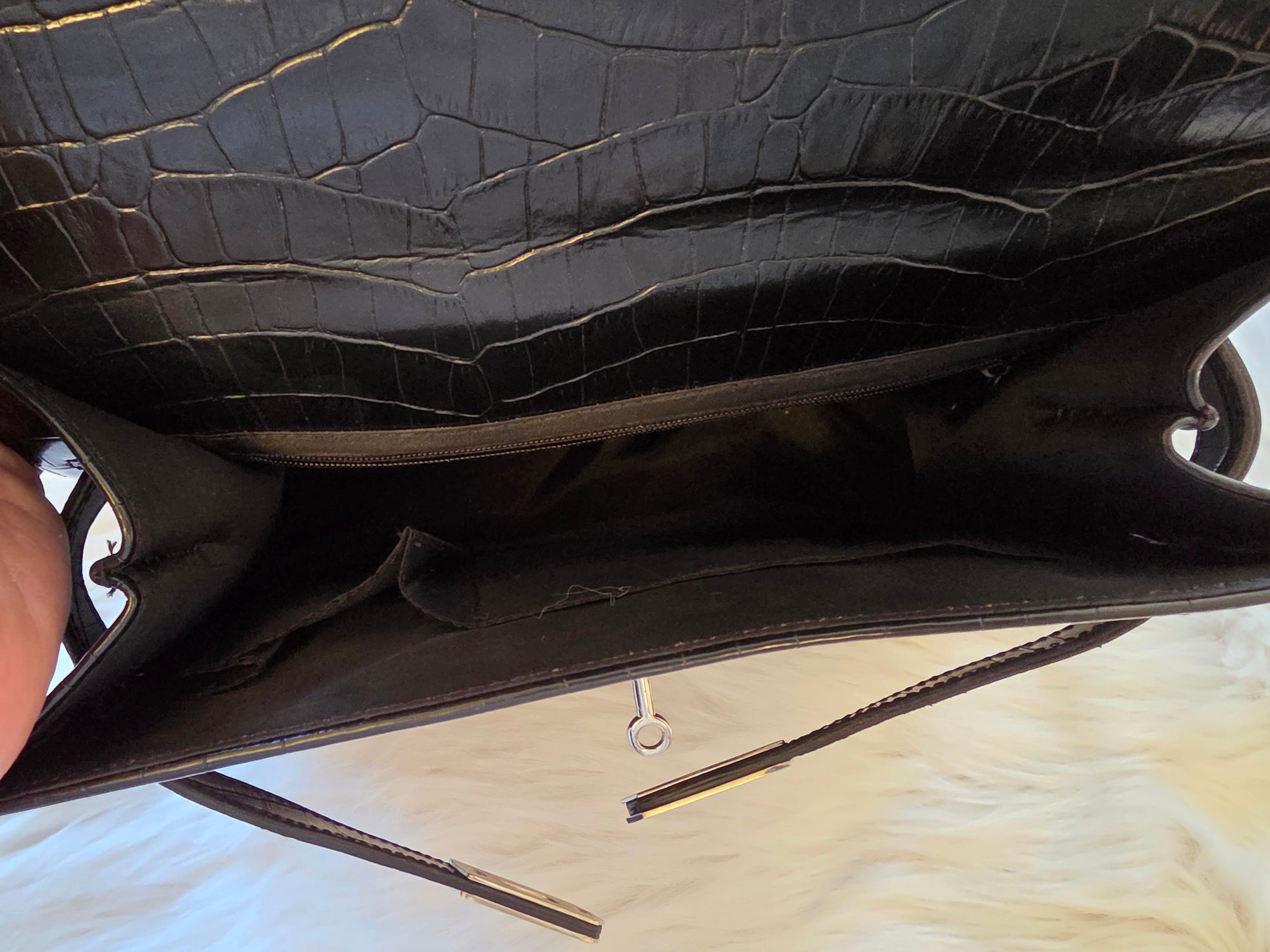 Add a touch of timeless sophistication to your wardrobe with this structured black handbag. Featuring a glossy crocodile-embossed finish, sleek silver-tone hardware, and a classic top-handle design, this piece is perfect for both day and evening wear. Its structured silhouette gives it a luxurious look while still being practical and stylish.