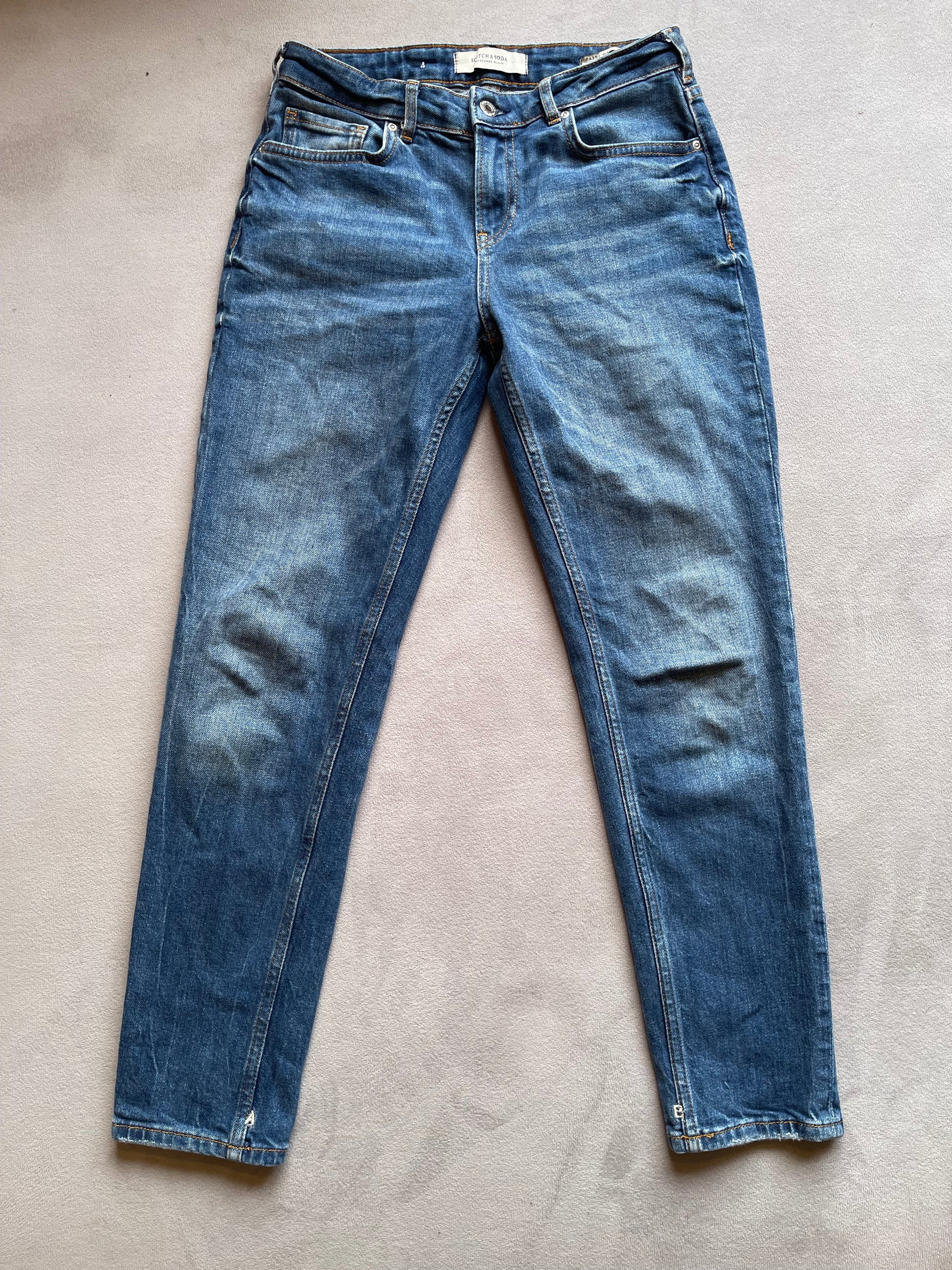 High-quality denim from the premium Amsterdams Blauw line. This is the flattering mid-rise "Keeper" slim-leg cut with classic fading. Features unique cuff zipper detail. Made in Turkey. Excellent secondhand condition—ready for a new owner!